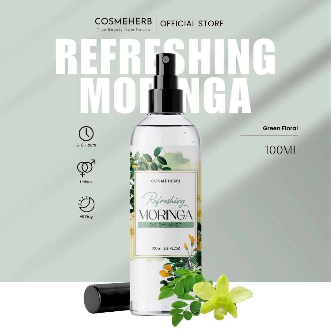 Wangi hijau floral alami dari daun moringa, lily putih, dan citrus lembut yang memberikan kesegaran alami.